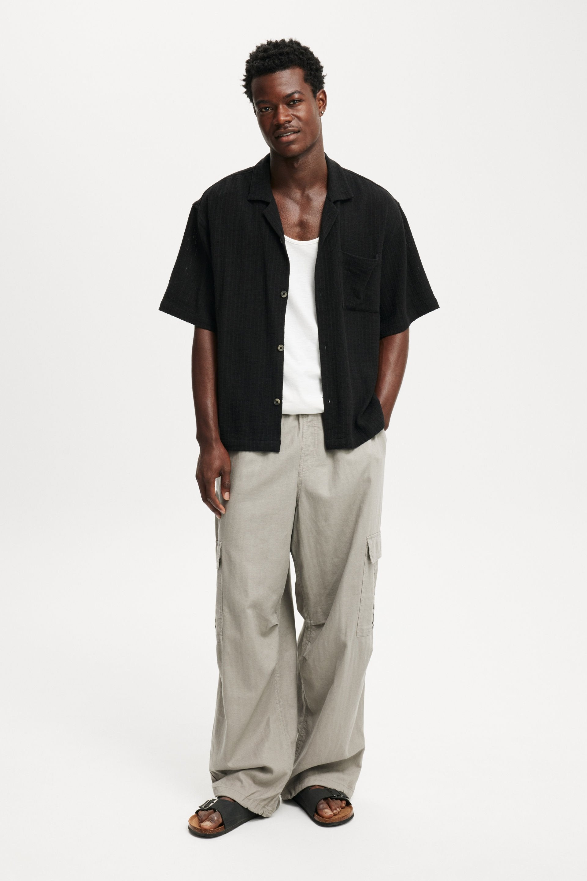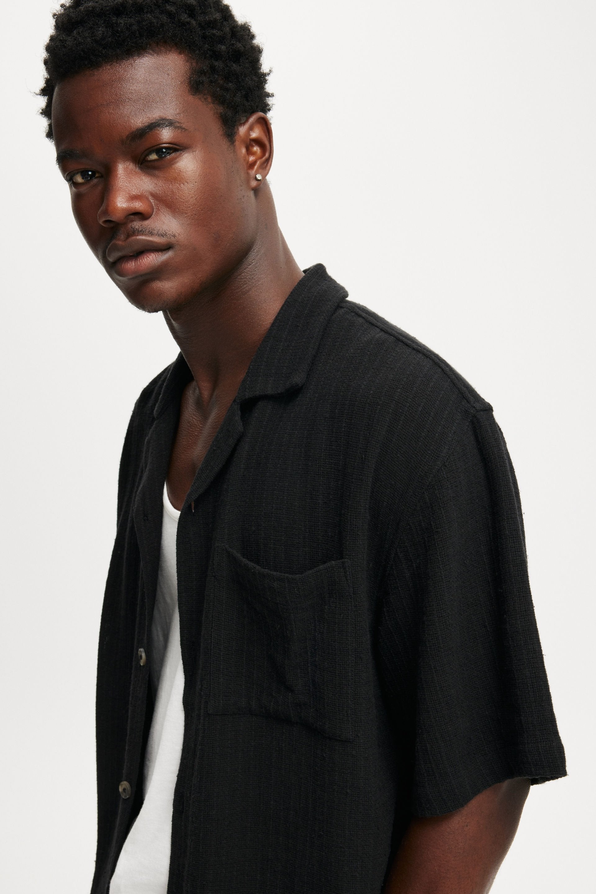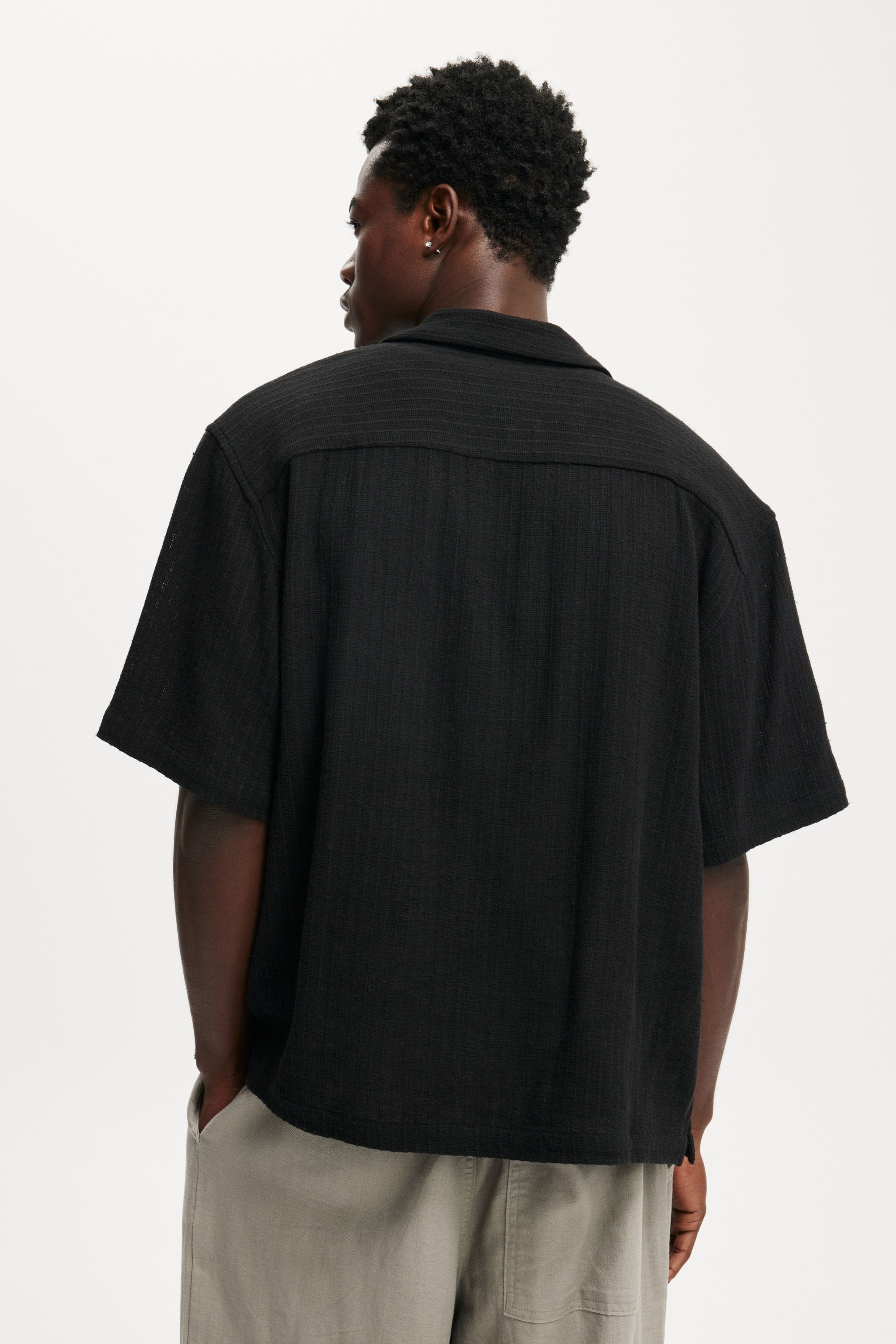 Introducing you to your new party shirt; The Box fit short sleeve shirt. Featuring a button front, camp collar, cropped and boxy fit. This is a staple for your shirts collection.